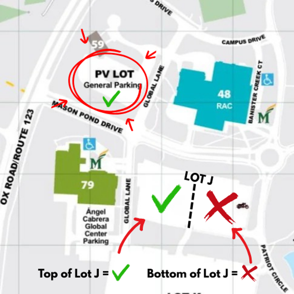 Park in the PV Lot or the TOP of Lot J for home basketball and volleyball games at the GMU RAC
